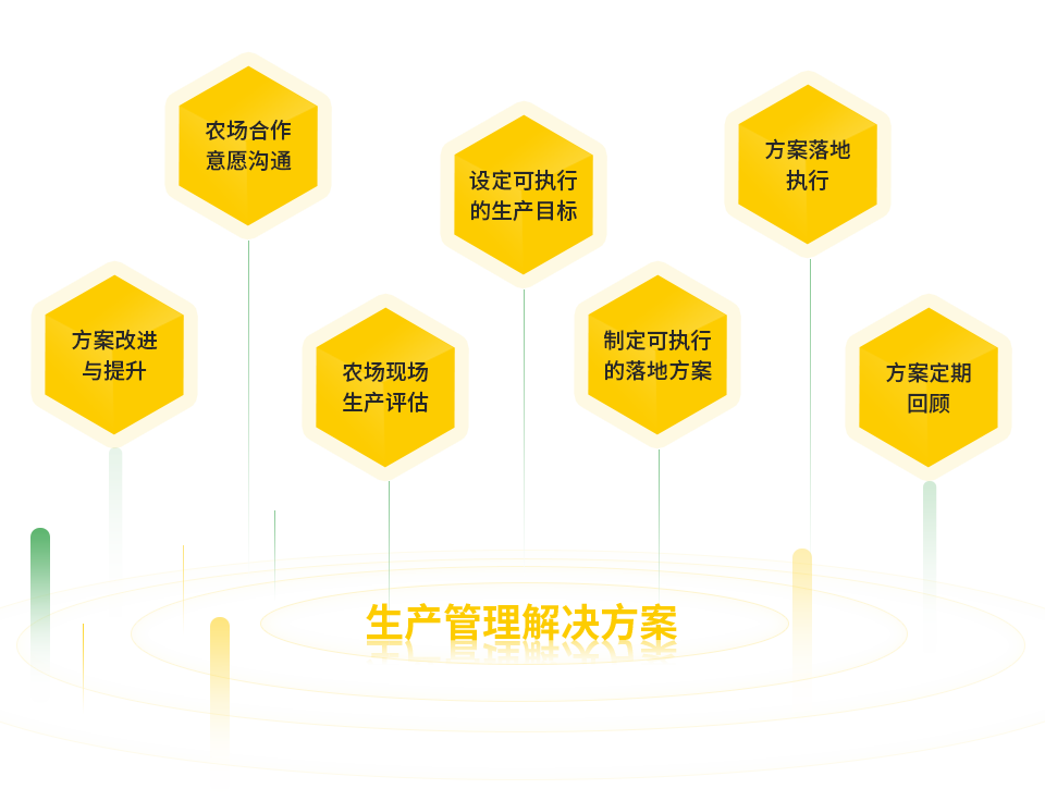 農(nóng)場合作意愿溝通、農(nóng)場現(xiàn)場生產(chǎn)評估、設定可執(zhí)行的生產(chǎn)目標、制定可執(zhí)行的落地方案、方案落地執(zhí)行、方案定期回顧、方案改進與提升,
